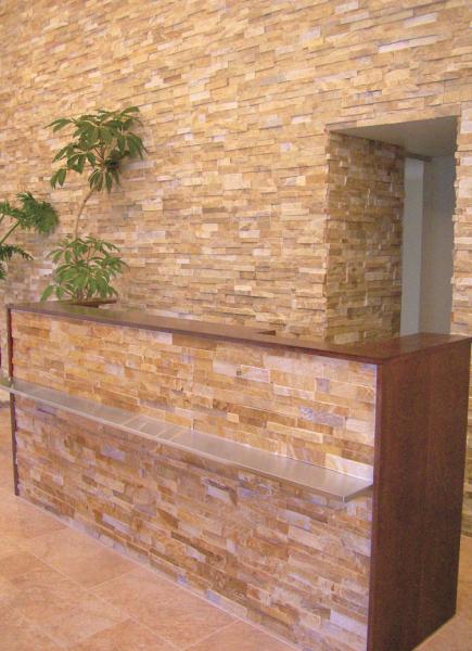 天然スレート石を細かく切断し、接着して形作ったタイル。自然な色幅は、天然石だからこそ出せる風合いです。外壁でも内壁でも重厚感を与えてくれる商品です。
